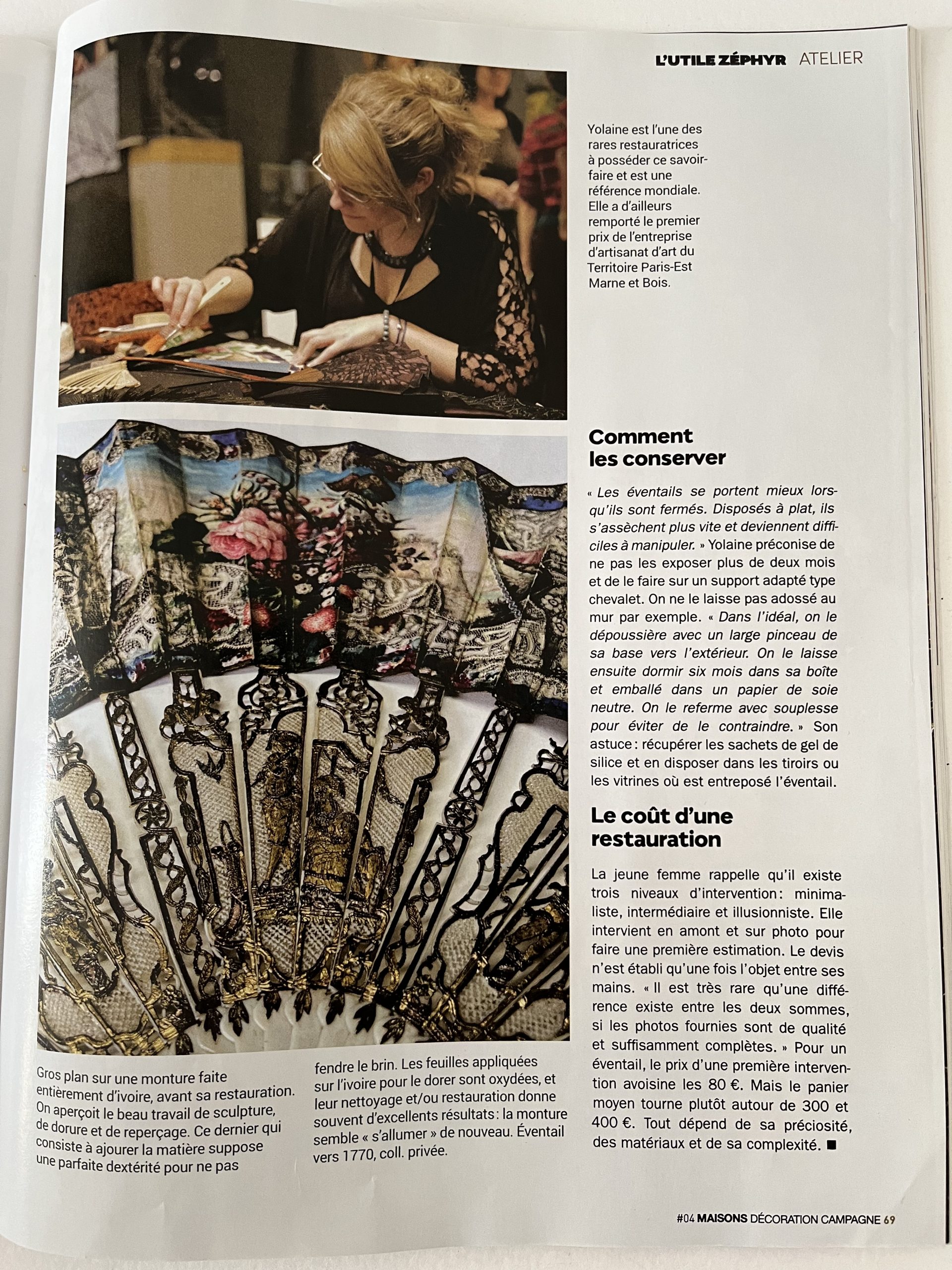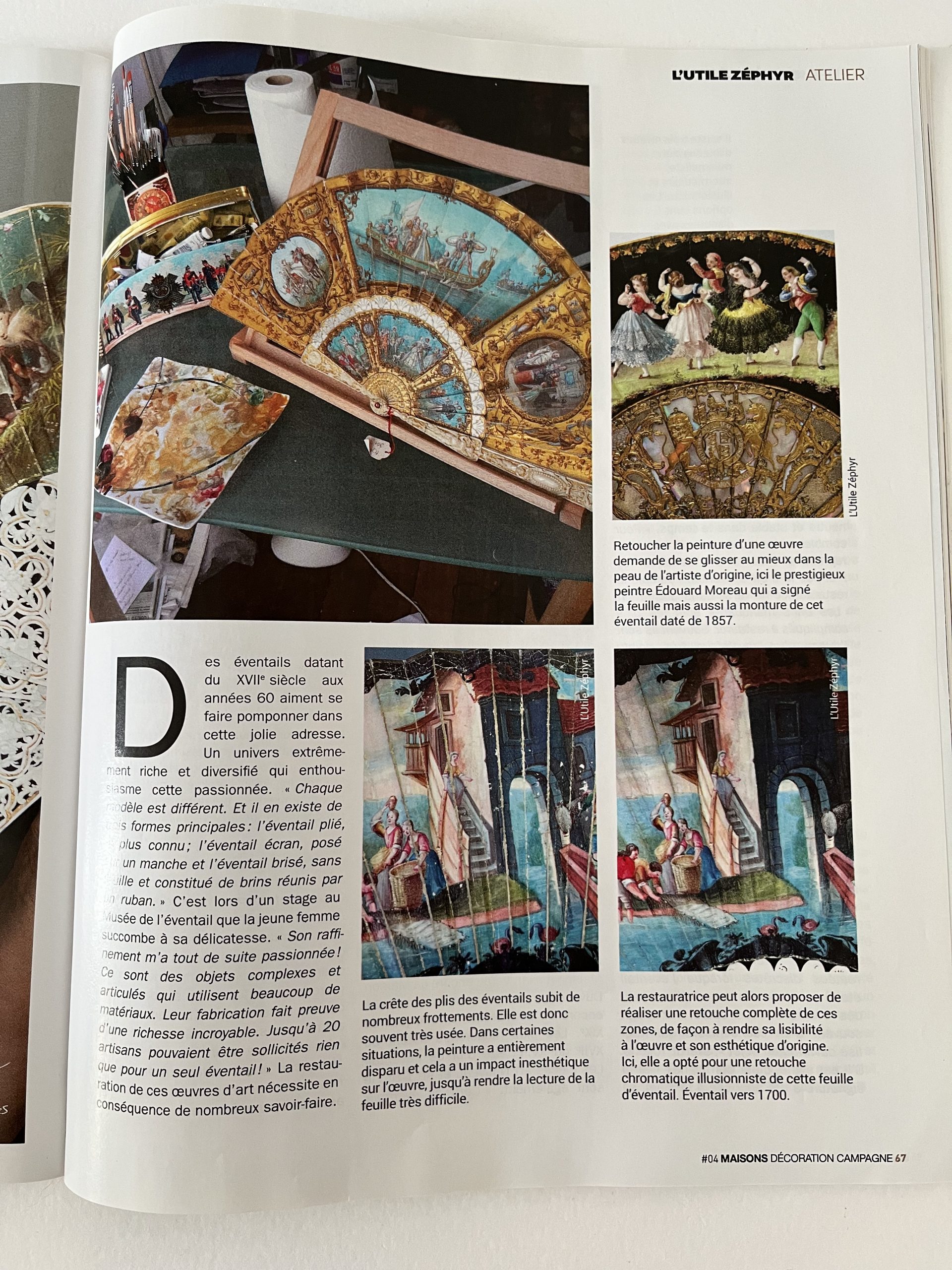 The “Atelier” section in issue 4 of this magazine showcases my expertise. With the help of several photographs, you will see the before and after of numerous restorations of globes and fans. Several stages of restoration are also described and illustrated.