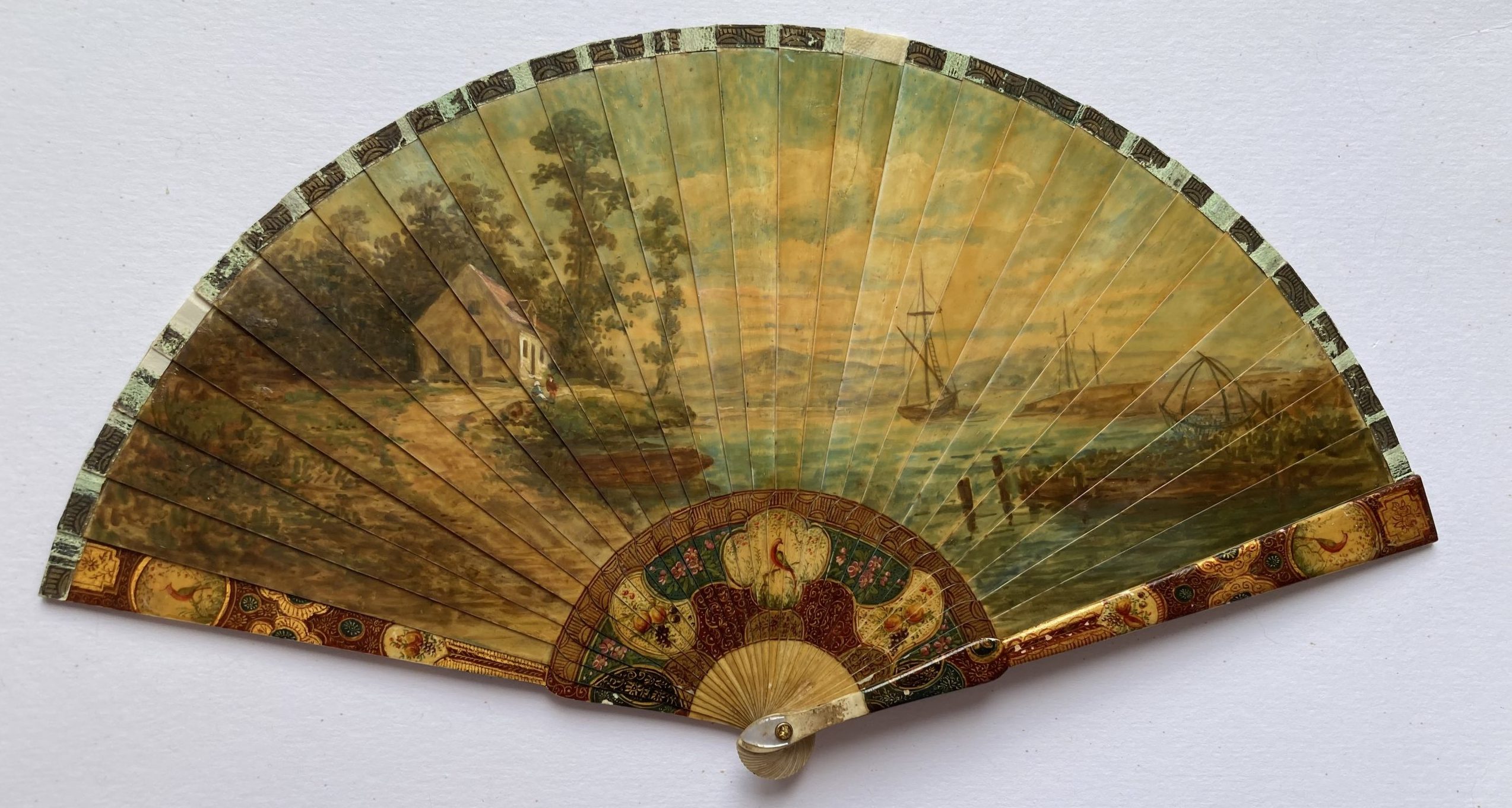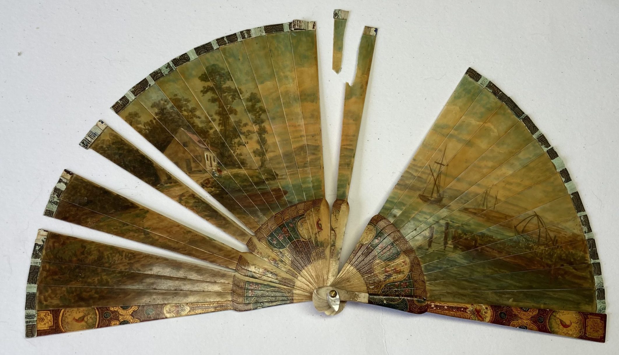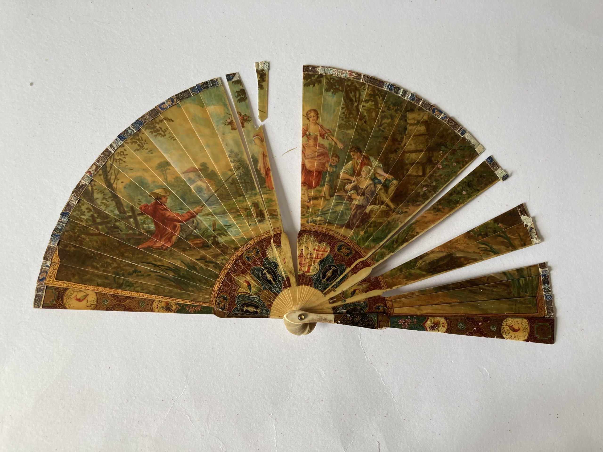La restauration de cet éventail a été très complète : un brin était cassé, le ruban de cabretille était rompu en plusieurs endroits et la peinture était très abîmée.