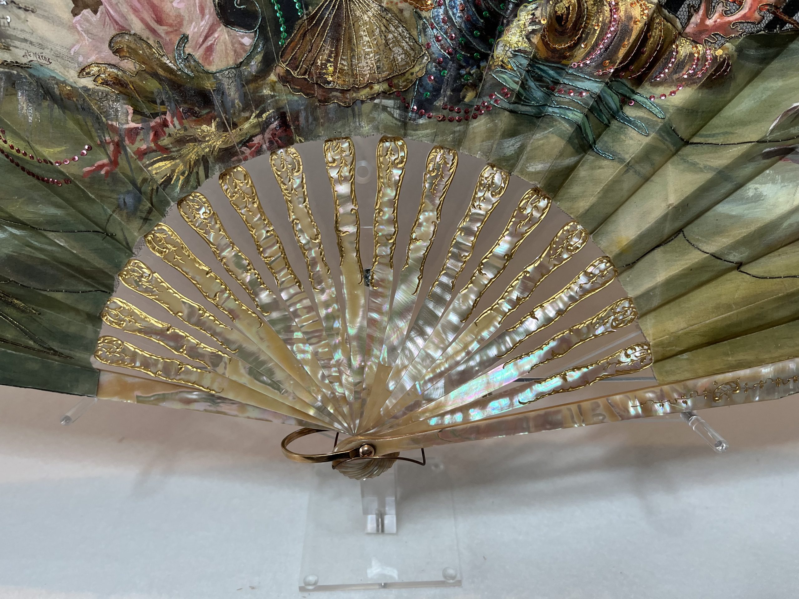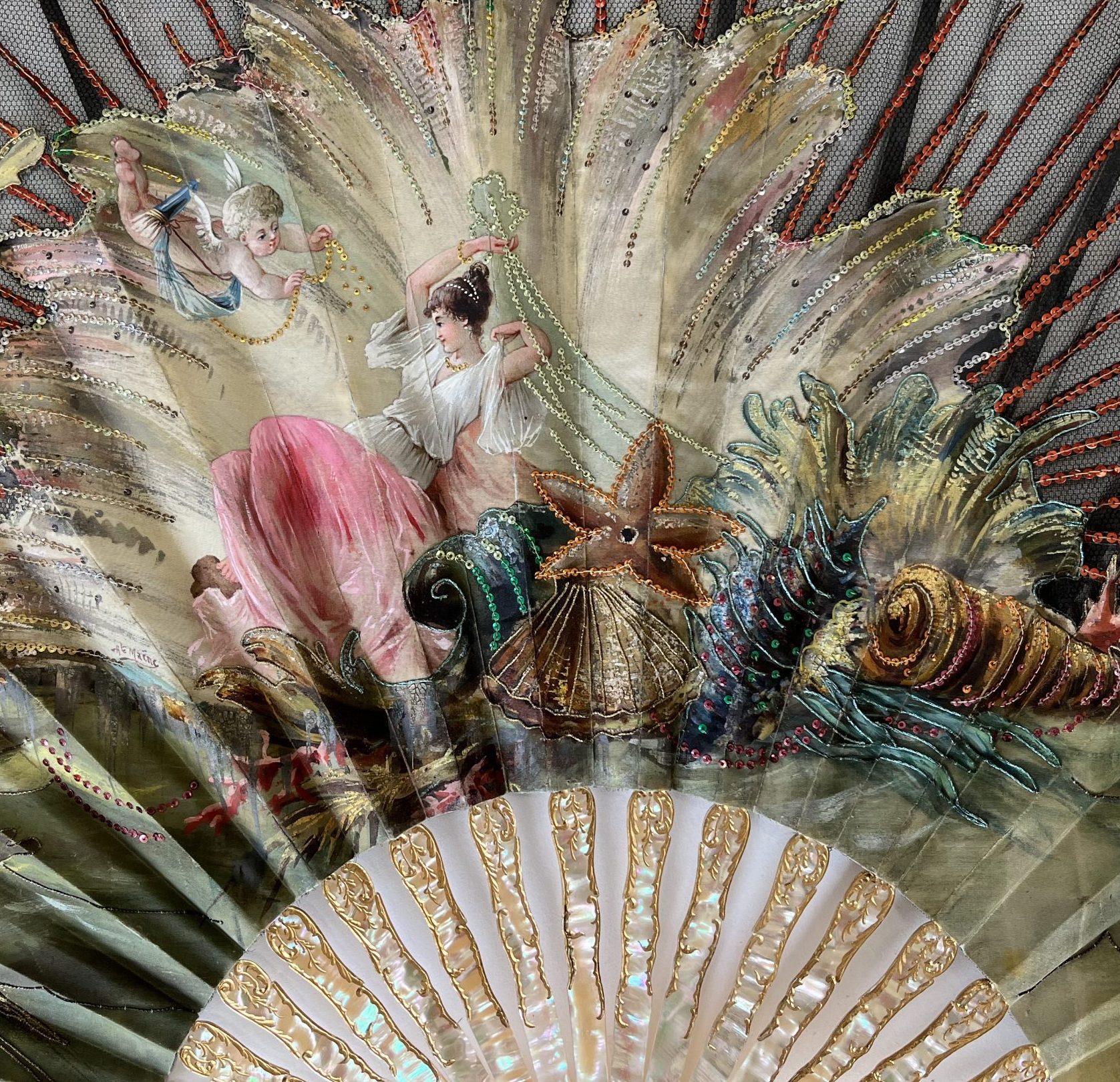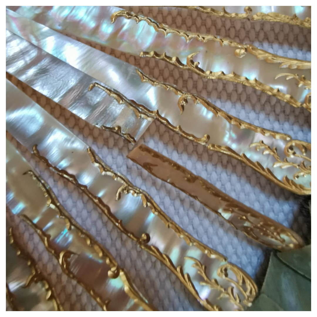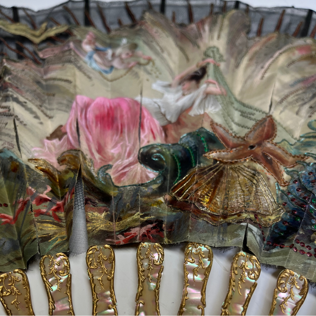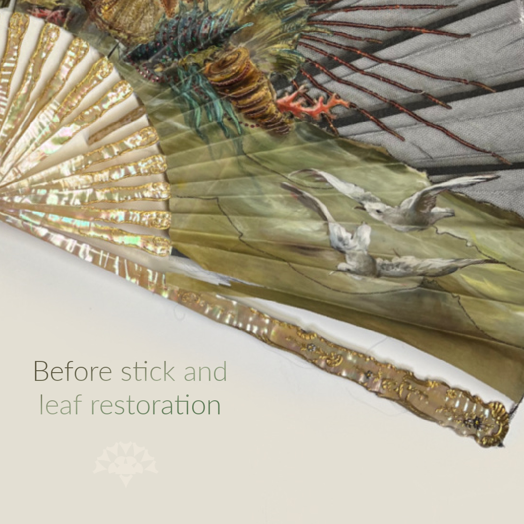 The leaf of this fan had multiple tears right through its central illustration. This was due to its starched primer and gouache paint, which stiffened it enormously. The folds become brittle, and give way as soon as the fan is opened or closed.
